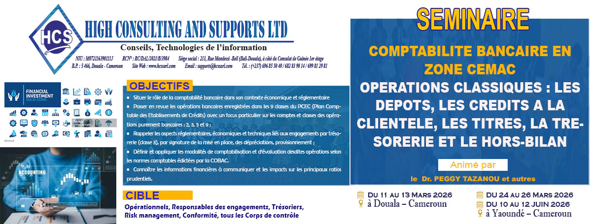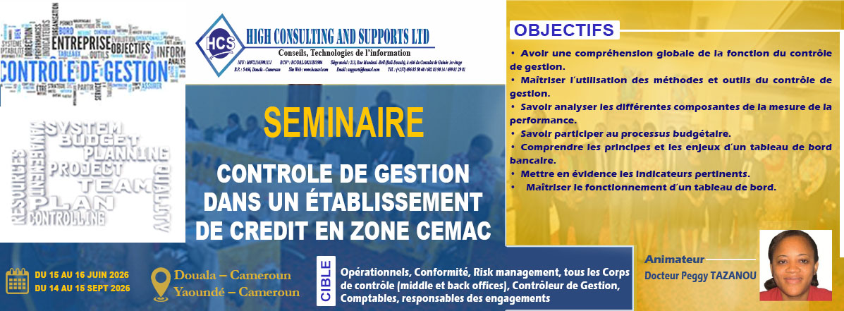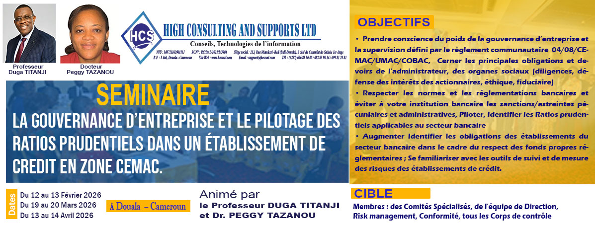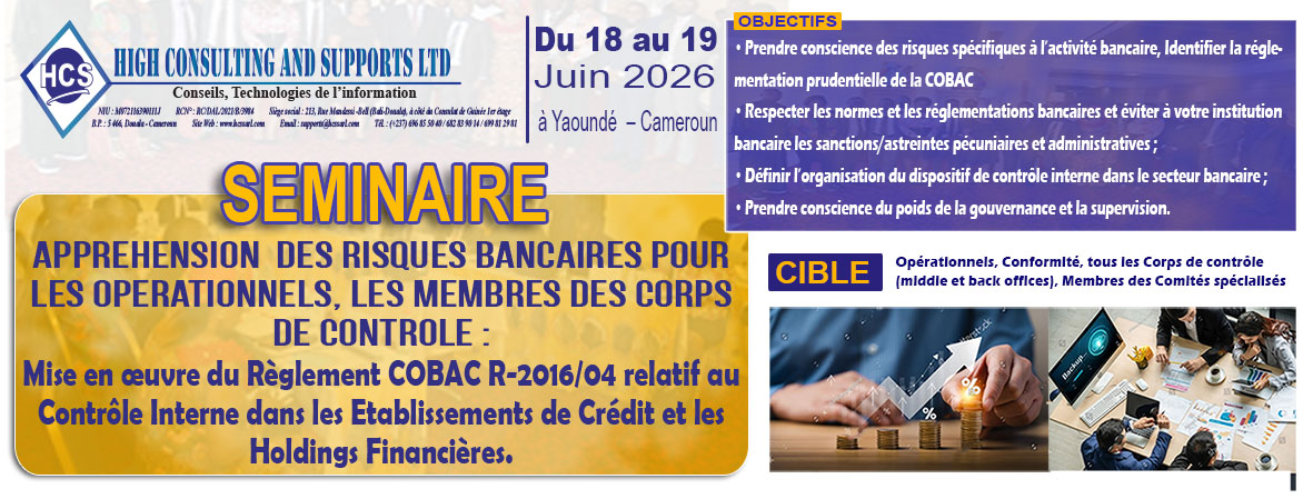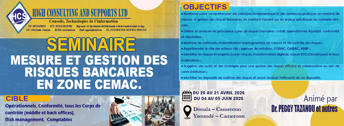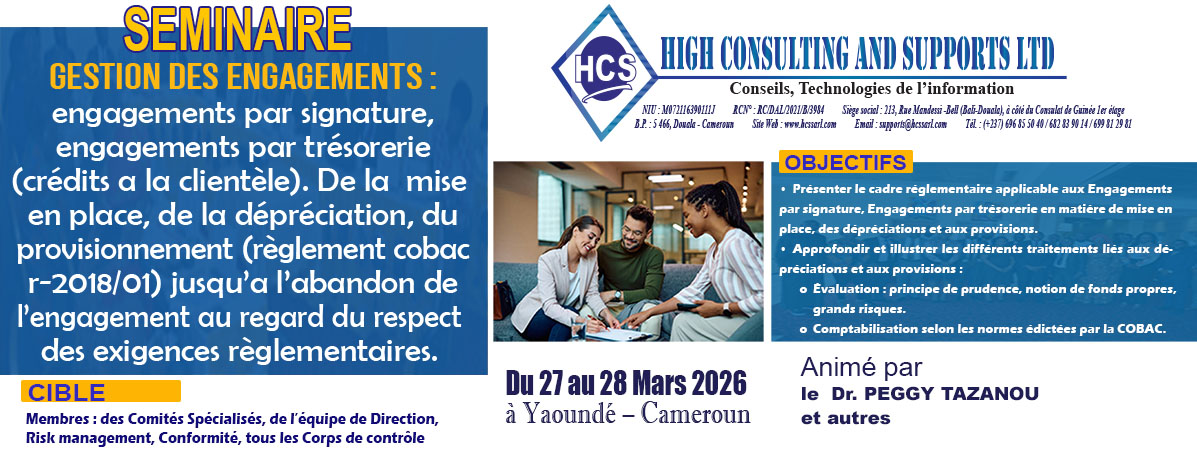 Nous contribuons au renforcement des compétences des établissements de crédits, financiers, micro finance et entreprises industrielles et commerciales de la sous régions Afrique Centrale.