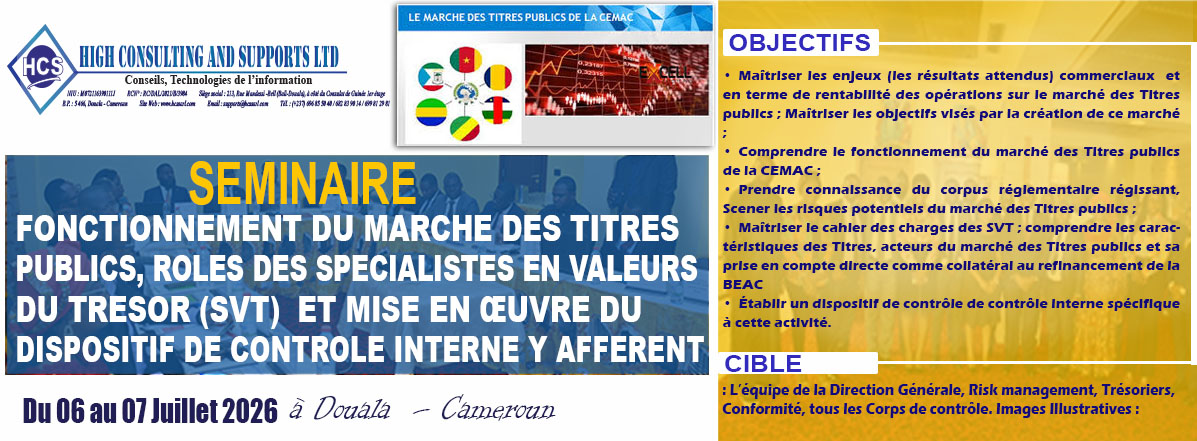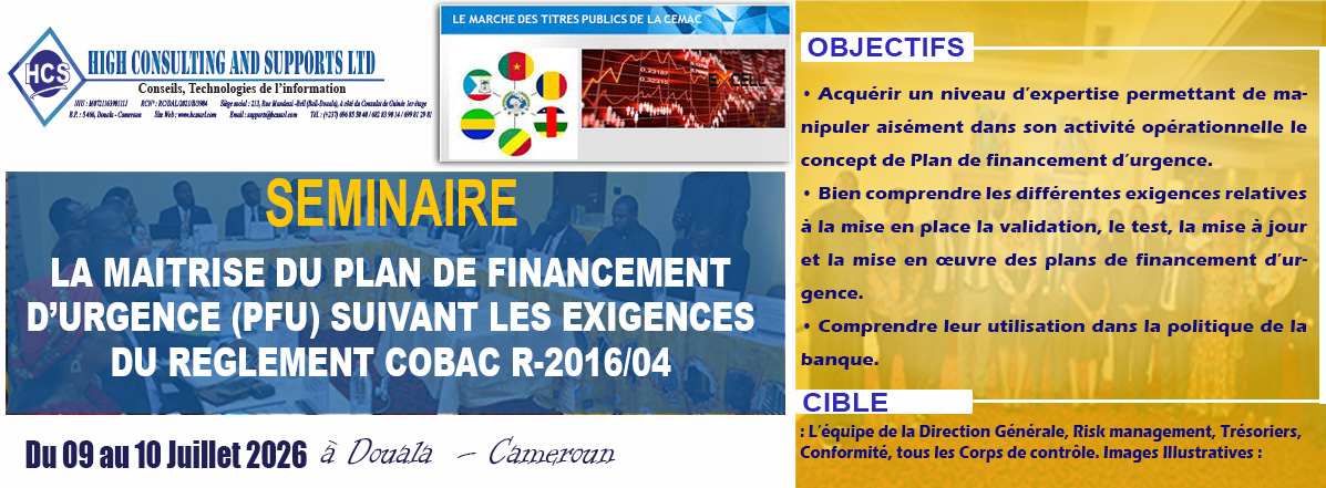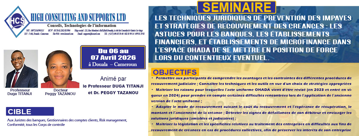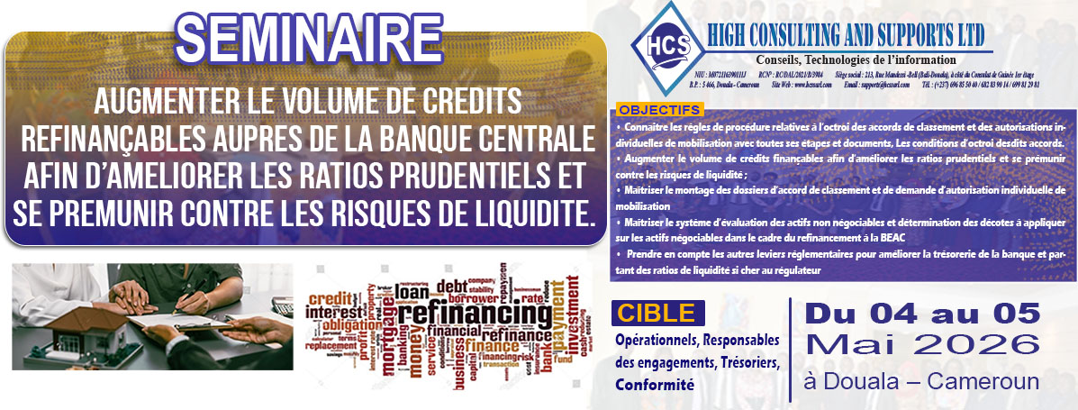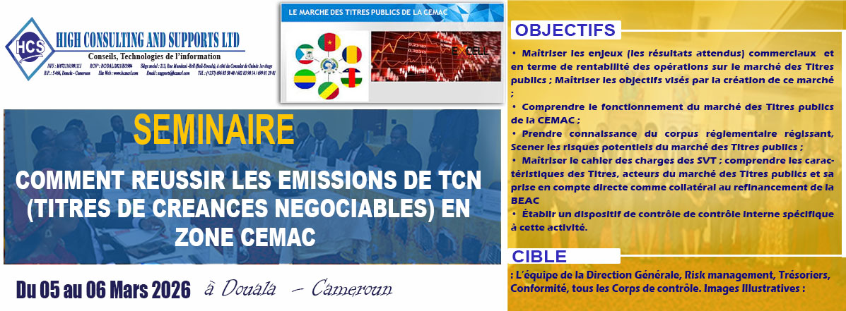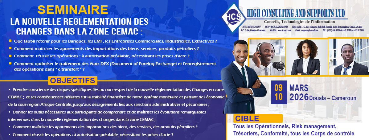 Nous contribuons au renforcement des compétences des établissements de crédits, financiers, micro finance et entreprises industrielles et commerciales de la sous régions Afrique Centrale.